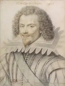 George Villiers, 1st Duke of Buckingham, KG (/ˈvɪlərz/ VIL-ərz; 28 August 1592 – 23 August 1628),[1][2] was an English courtier, statesman, and patron of the arts. He was a favourite and self-described "lover" of King James I of England.[3][4] Buckingham remained at the height of royal favour for the first three years of the reign of James's son, King Charles I, until a disgruntled army officer assassinated him.