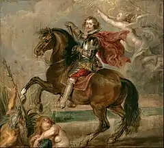 Rubens' other major commission, Equestrian Portrait of the Duke of Buckingham (1625) is accounted "the finest state portrait of its date in England".[66] The original was destroyed in a fire at the Le Gallais depository in St Helier, Jersey, on 30 September 1949, but a sketch by Rubens is now in the Kimbell Art Museum.[67] A summation of his career to date, it depicts Buckingham as Lord High Admiral of the fleet that is just visible in the background. Several other personal references are also incorporated. As Master of the King's Horses, he sits on a Spanish jennet (a breed he introduced to Britain), lifting a baton as his horse rears on command. Beneath him, the sea god Neptune and a naiad adorned with pearls indicate the duke's dominion over the sea. Overhead, a winged allegory of Fame signals victory (which nevertheless evaded the commander in real life) with trumpet in hand. Privately Rubens noted Buckingham's "arrogance and caprice" and predicted that he was "heading for the precipice".[68]
