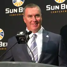 Georgia State's first head coach Bill Curry was the initial architect for the program. His tenure ended with a record of 10–23. Initially hired by the former athletics director Mary McElroy, after her termination by previous Georgia State president Carl Patton, Curry was named interim athletic director while the school searched for a new AD.[46] During his tenure as head coach, Curry saw the program grow from an idea into a fully fledged division I – FCS team. He also was present for the beginning of the transition from the football championship subdivision (FCS) to the football bowl subdivision (FBS) as the school changed athletics conferences from the Colonial Athletic Association to the Sun Belt Conference.[47] While Georgia State built the foundations for its football program with him at its helm, including new practice facilities and offices, Curry's teams experienced little success on the field. After a 6–5 record in its first season, the Panthers followed with a 3–8 record in its second season, and finally closing with a 1–10 record in his final year. However, the university honored its founding head coach by naming the locker rooms at the new football practice facility after Curry.[48]