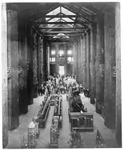 Glacier Park Lodge was intended to be a signature building. The lodge is built around a three-story lobby measuring 200 feet (61 m) by 100 feet (30 m), lined with Douglas-fir columns 40 feet (12 m) tall and between 36 and 42 inches (91 to 106 cm) in diameter. Each column was brought in by rail from the Pacific Northwest because trees in Montana rarely grow so large. A total of 60 such trees were used, with Douglas-fir in the lobby and cedars for the exterior. The logs in the main hall are detailed with smaller logs at their tops to resemble the Ionic order. The lodge was loosely styled as a Swiss chalet akin to other lodges built by the Great Northern between 1913 and 1917. The original structure contained 61 guest rooms, the lobby and the dining room. The addition housed another 111 guests.[1]
