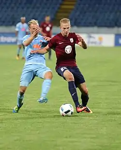 Kļuškins (in red) playing for Jelgava in 2016