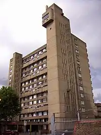 Glenkerry House is a housing block on the Brownfield Estate in Poplar, London, England, designed by the studio of the controversial Brutalist architect Ernő Goldfinger.[1] 14 storeys high, it stands in proximity to and complements the appearance of Balfron Tower and Carradale House, which were designed by Goldfinger himself and are now Grade II listed. There are four four-bedroom maisonettes on the ground floor, 18 one-bedroom, 45 two-bedroom and 12 three-bedroom flats; 79 flats in all.[2]