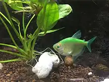 The GloFish is a patented and trademarked brand of fluorescently colored genetically modified aquarium fish. They have been created from several different species of fish: zebrafish (Danio rerio) were the first GloFish available in pet stores, and recently the skirt tetra (Gymnocorymbus ternetzi), tiger barbs (Puntius tetrazona),[1] Rainbow Shark (Epalzeorhynchos frenatum), Siamese fighting fish (Betta splendens), and most recently Bronze corydoras (Corydoras aeneus)[2] have been added to the lineup. They are sold in many colors, trademarked as "Starfire Red", "Moonrise Pink", "Sunburst Orange", "Electric Green", "Cosmic Blue", and "Galactic Purple", although not all species are available in all colors. Although not originally developed for the ornamental fish trade, it is one of the first genetically modified animals to become publicly available. The rights to GloFish are owned by Spectrum Brands, Inc., which purchased GloFish from Yorktown Technologies, the original developer of GloFish, in May 2017.