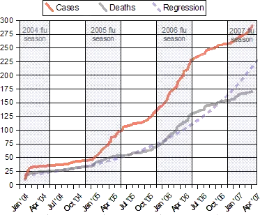 - Researchers discover H5N1 is far more dangerous than previously believed. "In the past, outbreaks of highly pathogenic avian influenza in poultry began following the primary introduction of a virus, of low pathogenicity, probably carried by a wild bird. The virus then required several months of circulation in domestic poultry in order to mutate from a form causing very mild disease to a form causing highly pathogenic disease, with a mortality approaching 100%. Only viruses of the H5 and H7 subtypes are capable of mutating to cause highly pathogenic disease. In the present outbreaks, however, asymptomatic domestic ducks can directly introduce the virus, in its highly pathogenic form, to poultry flocks."[4] Limiting this conclusion to domestic waterfowl proved to be wishful thinking, as in later months it became clear that nondomestic waterfowl were also directly spreading the highly pathogenic strain of H5N1 to chickens, crows, pigeons, and other birds and that it was increasing its ability to infect mammals as well. From this point on, avian influenza experts increasingly refer to containment as a strategy that can delay but not prevent a future avian flu pandemic.