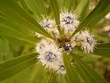 Erect shrub up to 2 m high with slender branches. Leaves 3.5-7 x 0.5–3 cm, alternate, narrowly to broadly lanceolate, entire, glabrous, acute, attenuate at the base, erect to erectopatent, evergreen. Inflorescences in dense globular heads with tomentose to glabrescent ovate axillary bracts, with densely long ciliate margins. Heads often less than 1.5 cm across, often crowded towards the tips of the stems, pale powder blue or whitish, hermaphrodite and zygomorphic. Calyx tubular, deeply 5-lobed, lobes linear, margins ciliate. Corolla 4 mm long with a slender tube, 2-lipped, the upper lip almost absent, the lower with 3 long lobes. Stamens exserted 4, style exserted, stigma bilobed. Fruit a small 1-seeded nut 1 mm, dark brown.