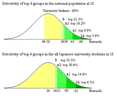The Hensachi in this diagram is calculated from the selectivity percentage (i.e. one-tailed P-value). - ↑ some vocational schools are reasonably selective. Thus it doesn't mean all university students are academically more talented than non-university students. Plus, the academic ability also depends on the subject and field of study. Therefore, we have to see the diagram as a rough indication.