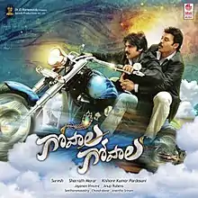 In mid-April 2014, Sohail Sen was selected to compose the music for the film which was his Telugu debut.[1] He also met the makers in Hyderabad for the music sittings later.[2] But Anoop Rubens replaced him in June 2014 as the music director of the film. The makers said that he composed and recorded a song before the launch of the film and it was also said that all the songs would be recorded in a week's time from the launch.[3] The film's soundtrack was reported to feature 3 songs in total and Pawan Kalyan was reported to appear in two of them. A unique audio launch was planned by the makers which was different from routine events.[4] Kailash Kher completed recording for a special song in the soundtrack on 12 December 2014.[5] Apart from the single track Bhaje Bhaaje written by Anantha Sreeram, the lyrics for the other two songs were penned by Sirivennela Sitaramasastri and Chandrabose; Sonu Nigam was the other playback singer apart from Kailash Kher and Haricharan.[6] The album cover features Pawan Kalyan's character riding a bike with Venkatesh's character sitting behind terrified.