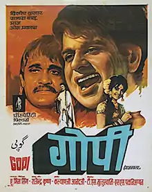 Gopi is a 1970 Hindi film produced by T. S. Muthuswami & S. S. Palaniappan and directed by A. Bhimsingh. It stars Dilip Kumar, Saira Banu in lead roles, with Pran, Om Prakash, Nirupa Roy, Farida Jalal, Johnny Walker, Ramayan Tiwari, Mukri, Sudesh Kumar, Durga Khote, Lalita Pawar in other important roles. The music was composed by Kalyanji-Anandji.