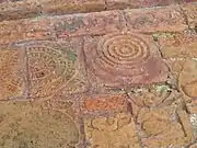 Left: Most of the terracotta plaques above the arches are missing, Right: A fully bloossomed lotus flower on a terracotta plaque above the entrance to the garbhagriha.