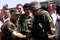 Radosavljević meets the Commanding General of Task Force Falcon Kenneth Quinlan, at the administrative boundary between Kosovo and Serbia during a meeting to discuss the success of the "Ground Safety Zone" reduction on 30 May 2001.
