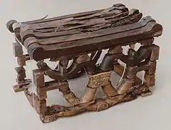 The destruction level of the city mound yielded carbonized fragments of what may be a serving stand, an inlaid table, and other elaborate pieces of furniture, fitted with bronze studs and brackets as well as finely carved ivory plaques.[23] Recent scientific advances have allowed the charcoal to be identified, indicating that boxwood, maple, yew, oak, and pine are present. Research into the form of the city mound objects is currently underway; consolidation of the carbonized wood has been deemed inadvisable and will not be undertaken.