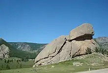 Gorkhi-Terelj National Park (Mongolian: Горхи-Тэрэлж [ɡɔrxi tɛrɛɮʃ], creek-rhododendron) is one of the national parks of Mongolia. The Terelj tourist zone has a number of "tourist camps" (Mongolian: жуулчны бааз, juulchny baaz). It is connected with Ulaanbaatar by a paved road (main road to the East #A0501 Baganuur-Öndörkhaan direction, 37 km from Ulaanbaatar city center, left turn to the branch #A24, 5 km later road crosses Tuul River and the National park territory begins). The road comes to the Gorkhiin Davaa (Mongolian: Горхийн даваа) pass. Most of the tourist camps and tourist attractions are before this pass. The road then ends at the settlement of Terelj, which features small shops and restaurants. The Terelj settlement is located in the valley of the Terelj River (Terelj Gol), approximately 66 km from the Ulaanbaatar city center. The national park tourist zone is formally in Nalaikh düüreg (district) part of Ulaanbaatar municipality, the rest of the protected zone beginning to the north of the Terelj River, is located in Mongolia's Töv Province (Töv aimag).[1]