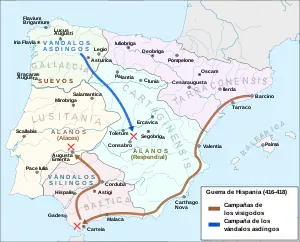 The Gothic War in Spain was a military operation of the Visigoths commissioned by the West Roman Empire. This operation consisted of multiple campaigns that took place between 416 and 418 and were directed against the Vandals and the Alans to restore Roman power in the Spanish provinces of Betica, Lusitania and Cartaginense.[1] As far as is known, the Roman field army was not involved in the battles, only foederati units fought on the side of the Romans.[1] According to Thompson played the Hasdingi in Gallaecia a dubious role in this war.