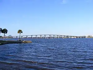 The Granada Bridge is a high-clearance bridge that spans the Halifax River and Intracoastal Waterway, linking the mainland and beach peninsula parts of Ormond Beach, Volusia County, Florida. Granada Bridge carries four lanes of State Road 40 and Granada Blvd.[1] The Casements, along with City Hall Plaza, Fortunato Park, and Riverbridge Park reside at the four corners of Ormond Beach's Granada Bridge,[2] which give their collective name to the annual "Four Corners Festival" in Ormond Beach.[3]