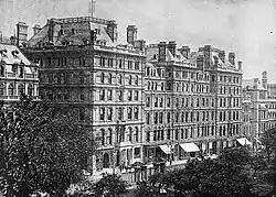 Before the 1870s, St Philip's churchyard was surrounded with Georgian terraces. However, as a result of the Second Birmingham Improvement Act of 1861, the buildings were to be cleared for the redevelopment of Colmore Row. As the leases on the buildings on Colmore Row began to end in the late 1860s, demolition began.[6] Barwick Street was constructed in 1870 and several plots of land bounded by Colmore Row, Church Street, Barwick Street and Livery Street were acquired to create the site of the hotel. Isaac Horton, a major Birmingham land and property owner and his architect and builder, Thomson Plevins, were very active in the acquisition of the land and developing it in line with the 1861 Act.[4] Plevins issued three separate contracts for the Colmore Row range of the hotel and construction work started in 1875 on the corner of Church Street.[4] The hotel opened on 1 February 1879, with 100 rooms and a further 60 unfinished at the time of opening.[4] Other facilities included a restaurant with an entrance fronting Church Street, two coffee rooms and stock rooms.[4] The stock rooms were an exhibition space where businessmen could demonstrate their new products and were built as the hotel aimed to attract most of its clients from commercial visitors from out of town.[1] The hotel was let to Arthur Field, a hotel operator from Newcastle upon Tyne. In 1880 the hotel was extended, when the corner of Church Street and Barwick Street was built.