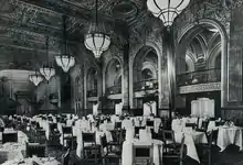 The interior was redesigned by Martin & Chamberlain in 1890–91, and in 1893–95 the firm built an eight-storey red brick and terracotta block fronting onto Barwick Street.[11] Within this block an elaborately decorated ballroom was built, named the Grosvenor Room. It is 100 feet (30 m) long and 32 feet (9.8 m) high.[1] The decoration includes ornate plasterwork, giant corinthian pilasters and elegant cartouches. The large elaborate art-deco light fittings date from the 1920s.[1] The double height ballroom was made possible with the innovative use of structural steelwork,[12] possibly the first of its kind in Great Britain, as the use of steel in construction was still in its infancy at the time.[1] The description of the Grosvenor Room in William Martin's obituary in the Birmingham Post states that:[13]
