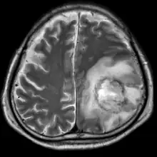 | T2-weighted MRI showing a necrotic brain absess as a result of GAE caused by an infection of Acanthamoeba, genotype T18 | |