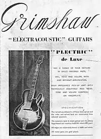 Details of instruments offered through the early 1940s are unknown, however by at least 1948 Grimshaw instruments had embraced electrification (for an example see this 1948 film[6] of Stéphane Grappelli including Dave Goldberg on an amplified non cutaway Grimshaw archtop guitar), with a late 1940s catalogue[7] showing electrified versions of the G.5 (the only model still with resonator, also the only non cutaway model) and electrified versions of the G.3, G.6, and new "Plectric" and "Plectric de Luxe" models, the latter being full-thickness archtop guitars with extraordinarily deep cutaways (example image shown at the top of this article), along with 2 electric solidbody "electrahawaiian" instruments somewhat similar to those produced by the Rickenbacker company. Grimshaw also applied for, and later received, a patent for their particular pick-up unit design, which was incorporated into the end of the fingerboard to avoid any structural interference with the acoustical vibrations of the guitar top (volume and tone controls, and the socket for the guitar lead, were located on the elevated plastic fingerboard, for a similar reason).