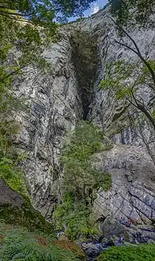 Gruta Casa de Pedra (SP-009) is a cave located in the karstic region of the Alto Ribeira Tourist State Park, between the municipalities of Apiaí and Iporanga, to the south of the State of Sao Paulo, Brazil.[1] It is 2,930 meters long and features the largest cave mouth in the world, measuring 172 meters high.[2] It is located in the final portion of the hydrographic sub-basin of the Maximiano stream which enters the cave for about 800 meters and flows into the Iporanga River.[3] Its name derives from the size of its portico, recognized as the world's largest.