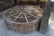 The Great Compassion Column (大悲幢) stands in front of the Mahavira Hall. It was made in 826 during the reign of Emperor Jingzong of the Tang dynasty (618907). It is over 2-metre (6 ft 7 in) high and made of green marble. Octagonal in shape, it has elegant style with a mushroom-shaped canopy on the top and engraved relief of Hercules at the bottom base. The Great Compassion Mantra in Sanskrit and Chinese are inscribed on the body.[7]