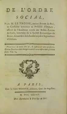 Guillaume-François Le Trosne, born 13 October 1728 in Orléans and died 26 May 1780 in Paris, was a French jurist and economist.[1] He is one of the main figures of physiocracy, a school of thought founded by François Quesnay and the Marquis de Mirabeau in July 1757.[2]
