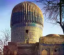 The Gūr-i Amīr or Guri Amir (Uzbek: Amir Temur Maqbarasi, Go'ri Amir, Persian: گورِ امیر) is a mausoleum of the Turco-Mongol[1] conqueror Timur (also known as Tamerlane) in Samarkand, Uzbekistan. It occupies an important place in the history of Central Asian architecture[2] as the precursor for and had influence on later Mughal architecture tombs, including Gardens of Babur in Kabul, Humayun's Tomb in Delhi and the Taj Mahal in Agra, built by Timur's Indian descendants, Turco-Mongols[3] that followed Indian culture with Central Asian influences.[4] Mughals established the ruling Mughal dynasty of the Indian subcontinent. The mausoleum has been heavily restored over the course of its existence.