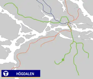 Högdalen metro station is on the Green line of the Stockholm metro, located in Högdalen, Söderort, Stockholm Municipality. The station was inaugurated on 22 November 1954 as the south terminus of the extension from Stureby. On 13 November 1959, the line was extended south to Rågsved.[2] The distance to Slussen is 7.3 km (4.5 mi). Högdalen metro station is connected to Högdalsdepån, a depot for subway trains.
