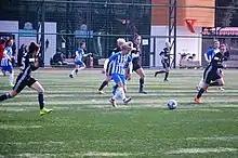 Hakkârigücü Spor (blue/white) attacking Beşiktaş J.K. (black/gray) in the 2018–19 Women's First League season's away match.