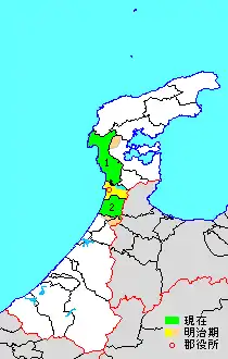 * yellow - areas formerly within the district borders during the early Meiji period