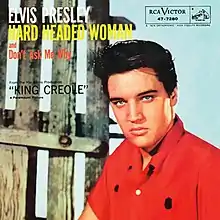 "Hard Headed Woman" is a rock and roll song recorded by Elvis Presley and published by Gladys Music, Presley's publishing company, in 1958. It is an American 12-bar blues written by African American songwriter Claude Demetrius. It was most notably recorded as a rock and roll song by Presley as part of the soundtrack for his 1958 motion picture King Creole, and was included on the record album of the same name. The song was also released as a single in both 78 RPM[1] and 45 RPM formats. In 1958, it went to No. 1 on the Billboard charts and went to No. 2 for two weeks on the R&B chart.[2] Notably, it became the first rock and roll single to earn the RIAA designation of Gold Record.