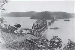 Design and construction of a replacement bridge commenced in 1939, due to concerns that the original bridge would not hold up to extra loading and traffic caused by transport demands of World War II.[1] Work commenced on the new bridge in July 1940 and despite best efforts it was not completed until after the war finished, opening for traffic on 1 July 1946. The new bridge was positioned 60 metres (197 ft) to the west or upstream of the original bridge and consists of eight spans in three different lengths and piers sunk to depths of up to 56 metres (183 ft).[7] New tunnels were bored through Long Island to the south and Cogra Point on the northern approach.[2][8]