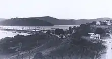 Whilst the main line terminated at Hawkesbury River, an arrangement of trackwork, sidings and platforms was provided on the causeway formed by reclaimed land on the eastern side of Long Island where the new Long Island tunnel had been constructed. The station was known as "River Wharf" and the tracks terminated at a wharf at the edge of the waterway. The purpose of the arrangement was to allow transhipment between the railways and river ferries, thus allowing passengers to cross the waterway, to another wharf on the northern side of the river, while the Hawkesbury River Bridge was under construction.[3] Hawkesbury River became a popular destination for day trippers and fishermen, outstripping the capacity of the original timber platform building. This was replaced in 1903 with the current brick building, which is of the type that had recently been adopted as the standard construction for island platforms.[4]