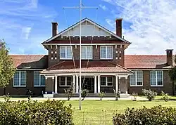 The completed Hay War Memorial High School was finally opened on 25 April 1923, Anzac Day, by the Minister for Education, Albert Bruntnell, with the final cost coming to £15,980.[29] The completed building included trachyte slabs as rolls of honour for the war memorial, installed on the façade.[30] The architectural journal, Building, noted that the school was "of exceptionally fine design in its architectural features. The brickwork used to fine advantage, and the entrance porch is a pretentious affair with broad steps and finely grouped columns."[31] On 20 May 1926, the school was visited by the Governor-General of Australia, Lord Stonehaven, who declared that it was the "finest war memorial in the British Empire".[32][33]