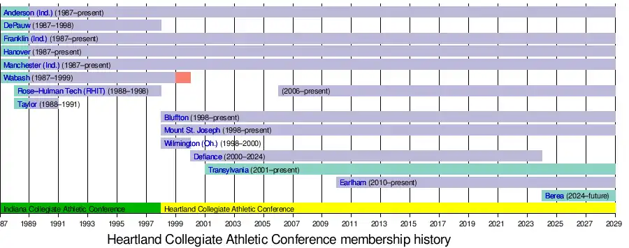 The addition of three Ohio schools (Bluffton College, the College of Mount St. Joseph, and Wilmington College) and the departure of two Indiana schools (DePauw and Rose-Hulman) during the 1998–99 season prompted a change in name to Heartland Collegiate Athletic Conference. Wabash and Wilmington later departed in the 1998–99 and 1999–2000 seasons respectively. Defiance College and Transylvania University joined in 2000 and 2001 respectively. Rose-Hulman re-joined the HCAC, effective for the 2006–07 season.