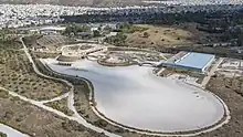 It consists of a competition course, a secondary training course, and a warm-up lake of natural form that occupies a total area of 27,000 square metres. The total land surface area consists of 288,000 square metres. The facility seats 7,600 spectators, though only 6,700 seats were made publicly available for the Olympics. The Olympic Canoe/Kayak Slalom Centre of Athens is unique because it used salt water, rather than fresh water, to inundate the course.