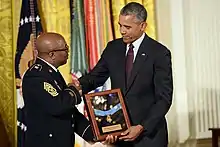 On May 14, 2015, the White House announced that Johnson would receive the Medal of Honor posthumously, presented by President Barack Obama.[16] In the ceremony, held on 2 June 2015, Johnson's medal was received on his behalf by Command Sergeant Major Louis Wilson of the New York National Guard. Obama said, "The least we can do is to say, 'We know who you are. We know what you did for us. We are forever grateful.'"[17]