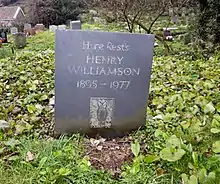 After a general anaesthetic for a minor operation Williamson's health failed catastrophically; one day he was walking and chopping wood, the next day he was unrecognisable and had forgotten who his family were. Suffering from senile dementia, he moved into a hospice at Twyford Abbey in Ealing. He died there on 13 August 1977, by coincidence on the day that the death scene of Tarka was being filmed. His body was buried in the graveyard of St George's Church, Georgeham, North Devon.[20] At a service of thanksgiving in St Martin-in-the-Fields, Ted Hughes delivered the memorial address.[21]