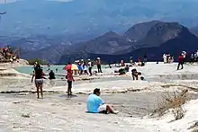 Hierve el Agua (Spanish for "the water boils") is a set of natural travertine rock formations in San Lorenzo Albarradas, Oaxaca, Mexico that resemble cascades of water.[1][2] The site is located about 70 km east of Oaxaca City,[3] and consists of two rock shelves or cliffs which rise between fifty and ninety metres from the valley below, from which extend nearly white rock formations which look like waterfalls. These formations are created by fresh water springs, whose water is over-saturated with calcium carbonate and other minerals. As the water trickles over the cliffs, the excess minerals are deposited, much in the same manner that stalactites are formed in caves.[1] One of the cliffs, called the "cascada chica" (small waterfall) or the Amphitheatre, contains two large artificial pools for swimming as well as a number of small natural pools.[4][5] One of the artificial pools is very near the edge of the cliff.[3]