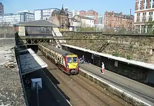 Train arriving at Glasgow High Street. The campus buildings of Strathclyde University are visible at the top of the photograph.