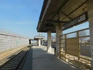 The Highland Lake/Lewisville Village station in February 2017. A milepost sign for Interstate 35E is present on the left.