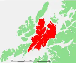 Hinnøya is the fourth-largest island in Norway, and the largest outside the Svalbard archipelago. The 2,204.7-square-kilometre (851.2 sq mi) lies just off the western coast of Northern Norway.[1] The island sits on the border of Nordland and Troms og Finnmark counties. The western part of the island is in the district of Vesterålen, the southwestern part is in the Lofoten district, the southeastern part is in the Ofoten district, and the northeastern part is in Troms.[2] As of 2017, Hinnøya had a population of 32,688.[2] The only town on the island is the town of Harstad. Some of the larger villages include Borkenes, Lødingen, Sigerfjord, and Sørvik. The island is split between the municipalities of Harstad, Tjeldsund and Kvæfjord in Troms og Finnmark county, as well as Andøy, Hadsel, Lødingen, Sortland, and Vågan in Nordland county.[2]