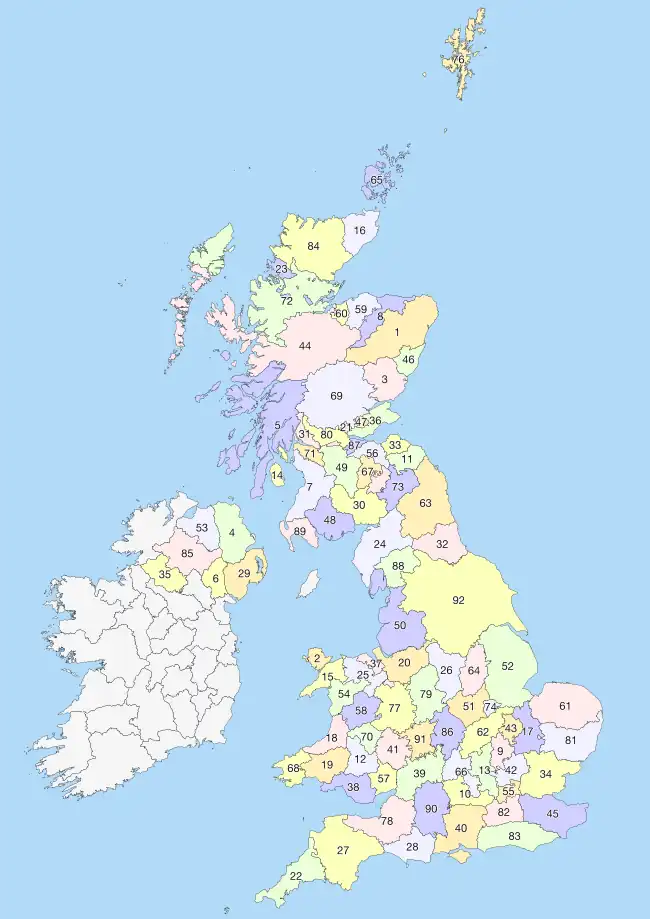 The Historic counties of the United Kingdom are ancient geographical divisions of the United Kingdom. Although not defined by any one function, over many centuries, various forms of administrative function have been based on them.[3] These have included the areas of Parliamentary constituencies, the Court of quarter sessions, the areas in which a Lord-lieutenant and Sheriff serve, territorial units of the Militia, as well as the basis of the original county councils. Although these areas have subsequently changed, the historic counties on which they were originally based have not.[4] The Office for National Statistics recommended them in the Index of Place Names as a stable, unchanging geography which covers the whole of Great Britain.[2]