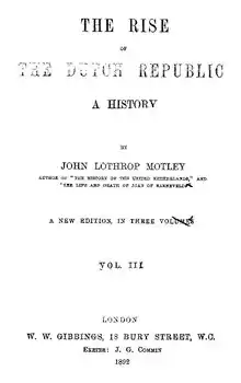 The liberal Reinier Cornelis Bakhuizen van den Brink (born 1810) made important contributions to Eighty Years' War studies starting in 1844, and as the National Archivist from 1854 to 1865.[16] According to Winkler Prins (2002), Bakhuizen 'renewed and raised historical scholarship together with Robert Fruin as historian and unsurpassed master of historical criticism.'[16] In 1857, he translated The Rise of the Dutch Republic (1856) from the American puritan historian John Lothrop Motley.[17] Bakhuizen was very positive about the book: "The work of Motley seems to me to represent such a proper foundation for the history of the formation of the Commonwealth of United Netherlands, that it almost becomes a duty to contribute everything that one himself possesses to continue building on that foundation."[18] Fellow liberal historian Robert Fruin published an almost equally positive review of the book in 1859, admiring Motley's talents as a writer, agreeing with Bakhuizen's "favourable judgement wholeheartedly", although the book required some "addition and correction".[19]