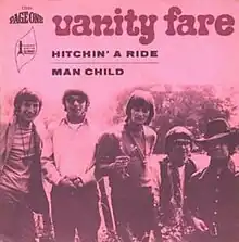 "Hitchin' a Ride" is a song written by Mitch Murray and Peter Callander issued as a single by the English pop/rock band Vanity Fare in late 1969. It reached number 16 on the UK Singles Chart in February 1970 but was a bigger hit in the United States, reaching number 5 on the Hot 100 on June 27, 1970. Billboard ranked the record as the number 14 song of 1970.[3] In Chicago, the record achieved even greater heights, topping the WCFL Big 10 Countdown on 18–25 May 1970,[4] ranking #4 for all of 1970[5] and ranking #12 on rival WLS Radio 89 Hit Parade on 6 July 1970,[6] ranking #10 for all of 1970.[7] "Hitchin' a Ride" sold a million copies in the United States alone, and it became a gold record.[8]