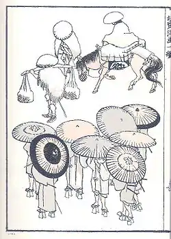 The first volume of 'Manga' (Defined by Hokusai as 'Brush gone wild'), was an art instruction book published to aid his troubled finances. Shortly after he removed the text and republished it.[6] The Manga show a dedication to artistic realism in the portrayal of people and the natural world. The work was an immediate success, and the subsequent volumes soon followed. The work became known to the West after Dutch-employed German physicist Philipp Franz von Siebold took lithographs of some of the sketches to Europe where they appeared in his influential book on Japan,[1] Nippon: Archiv Zur Beschreibung von Japon in 1832. The work began to circulate in the West soon after Matthew C. Perry's entry into Japan in 1854.[7]