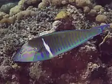 Hologymnosus doliatus has a long, slender body covered with small scales, although it has a naked head. The males are bluish-green to pale reddish marked with lavender bars, they have a pale band to the rear of the pectoral fin and orange lines mark the head. Females are bluish, greenish or greyish and have 20-23 orange bars along their flanks with a bluish-black spot on the posterior edge of the gill cover. The juveniles are whitish in colour and have three thin orange-red stripes.[4] The dorsal fin has 9 spines and 12 soft rays while the anal fin has 3 spines and 12 soft rays. They can grow to a length of 50 centimetres (20 in).[5]