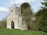 In 1916 Cox stated that Holywell is a chapelry of Careby parish. The church in Holywell Hall grounds was moved in 1699 from a site east of the Castle Bytham road 'between the bridge and the mill' where it had been subject to frequent flooding.[4] It incorporates material from the destroyed church of Aunby, including two Norman piers that support the tower, a Decorated doorway and a window glazed with Perpendicular style glass.[5] Pevsner adds that St Wilfrid's church stands south of Holywell Hall as one of its garden ornaments, has an east window with a mosaic of small fragments from the 15th to 19th centuries, and a paten and chalice dated 1662.[6] St Wilfrid's is Grade II* listed.[7]