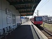 The station has a single side platform serving bi-directional traffic, connected to a small station building with rounded walls.