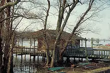 Changes in the course of the Mississippi River resulted in the shape of the lake. The lake is a former meander in the Mississippi River that was cut off, shortening the river, and is no longer connected to the river.