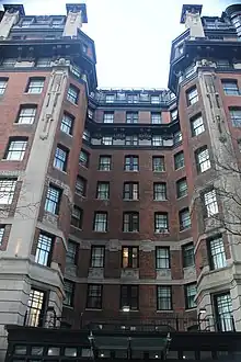 The facade is largely made of red brick with ornamentation made of limestone, metal, and terracotta.[13][20] This contrasted with later buildings by Roth's firm (including the San Remo), which generally contained buff-brick and limestone facades.[21] Both the Broadway and 77th Street elevations of the facade are divided horizontally into three sections: a two-story base, a six-story midsection, and a two-story capital. the third through seventh stories are largely clad with brick; and the ninth and tenth stories form a mansard roof.[13][20] The southern and eastern elevations are largely clad in plain brick and contain windows; the southern elevation is a party wall abutting another building.[22]